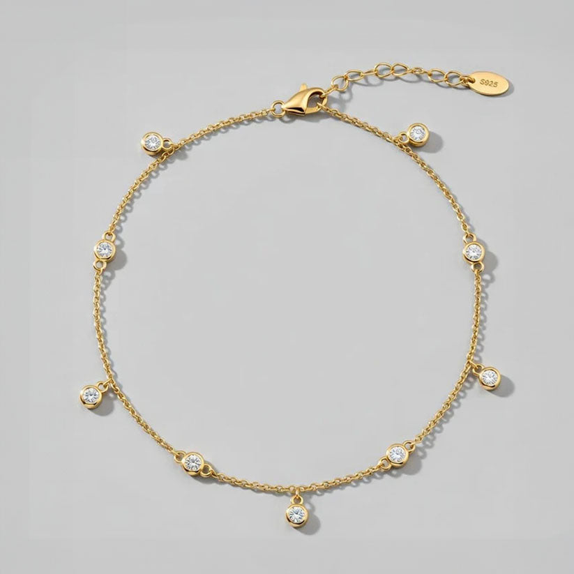 Fotlänk i 925 sterlingsilver med gnistrande stenar placerade längs kedjan. Den skimrande designen fångar ljuset vid varje steg och ger en stilfull, somrig detalj som alltid känns rätt.