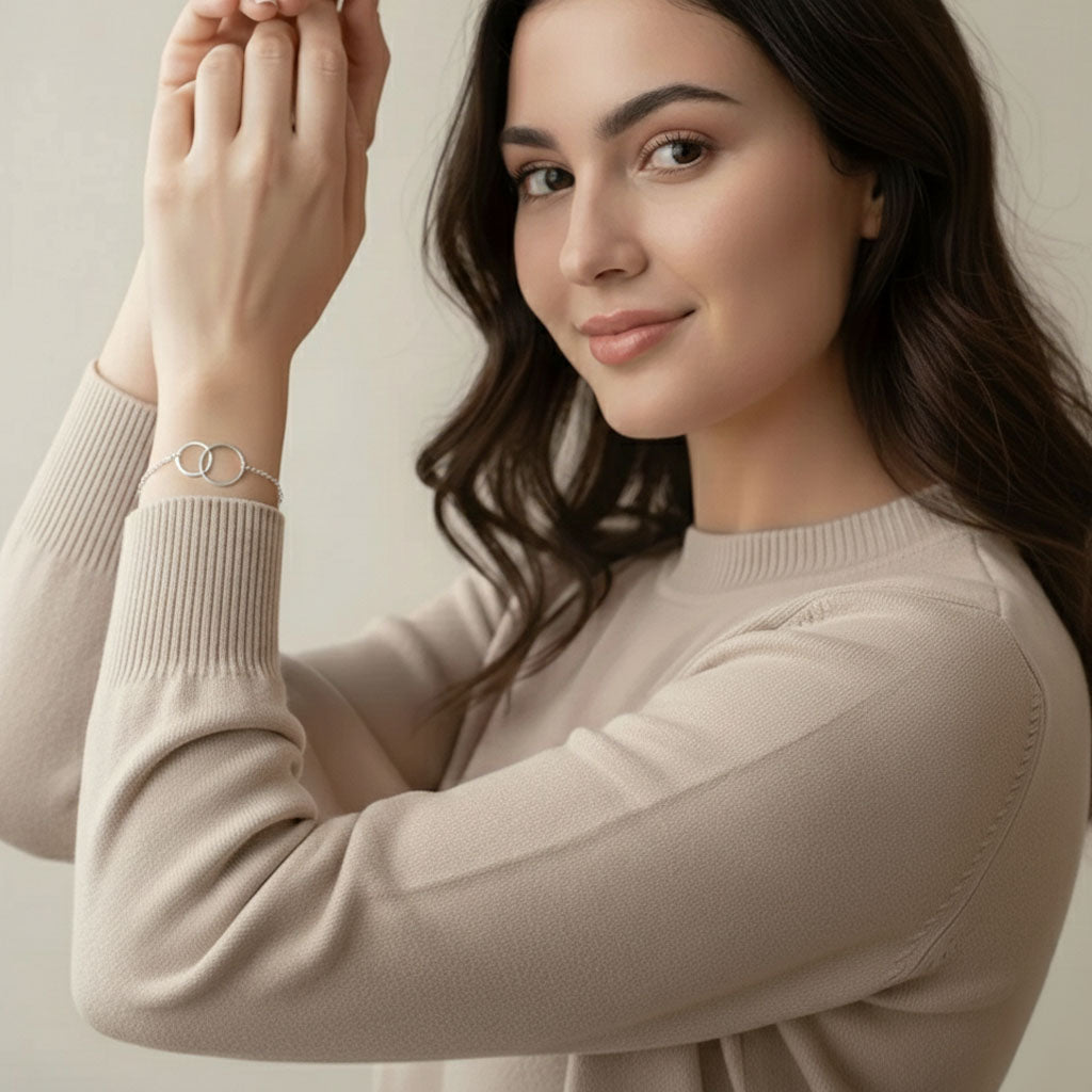 Vårt stilrena sterlingsilverarmband med två sammanlänkade cirklar erbjuder en minimalistisk design som passar för alla tillfällen. Dess enkla och rena uttryck gör det till det perfekta tillbehöret för både vardag och fest.