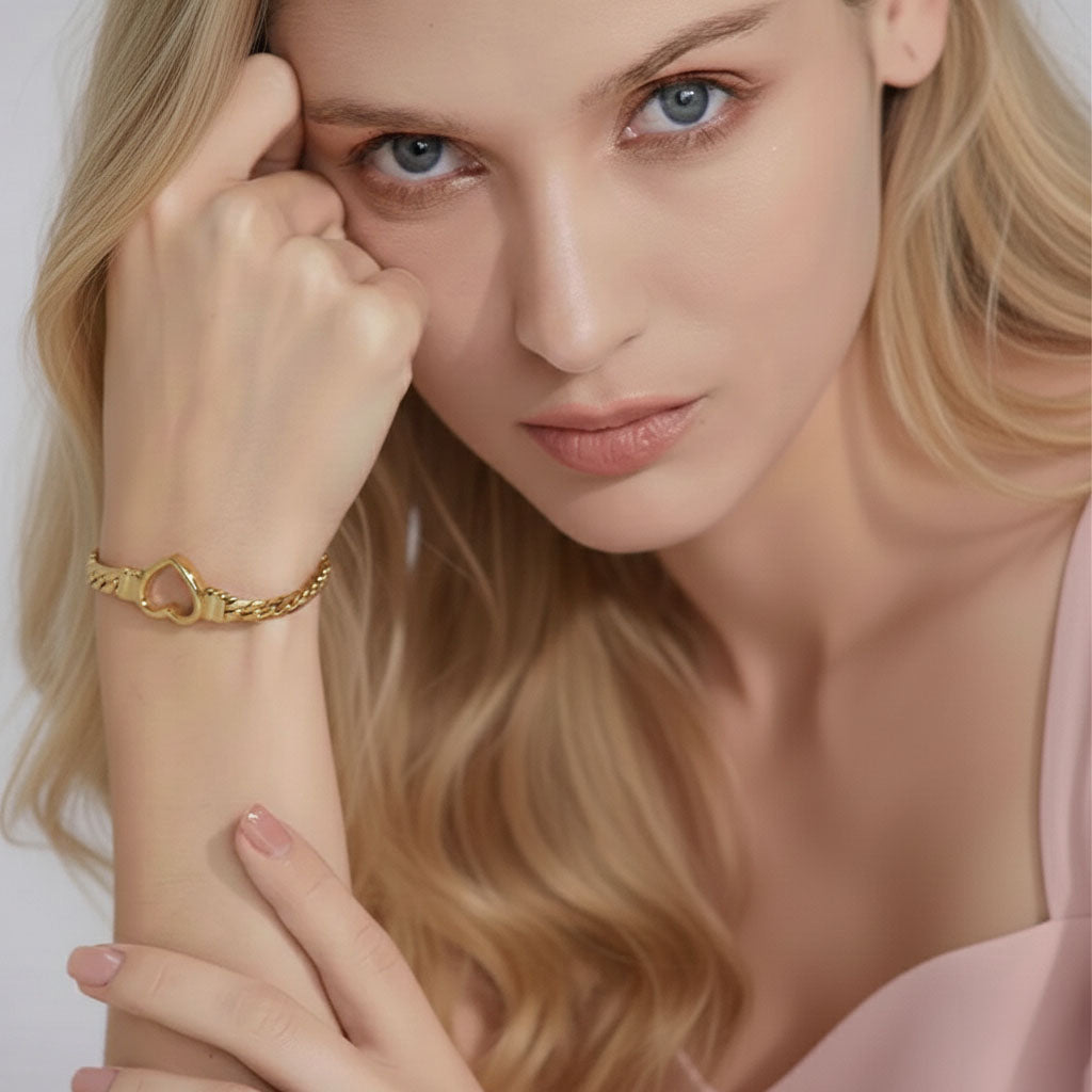 Upptäck vårt stilfulla armband tillverkat av hållbart rostfritt stål, utformat med en robust kedja och ett elegant hjärtmotiv. Välj mellan tidlöst silver eller lyxig guldplätering. För en oemotståndlig och djärv stil, kombinera armbandet med vårt matchande Lovis-halsband.