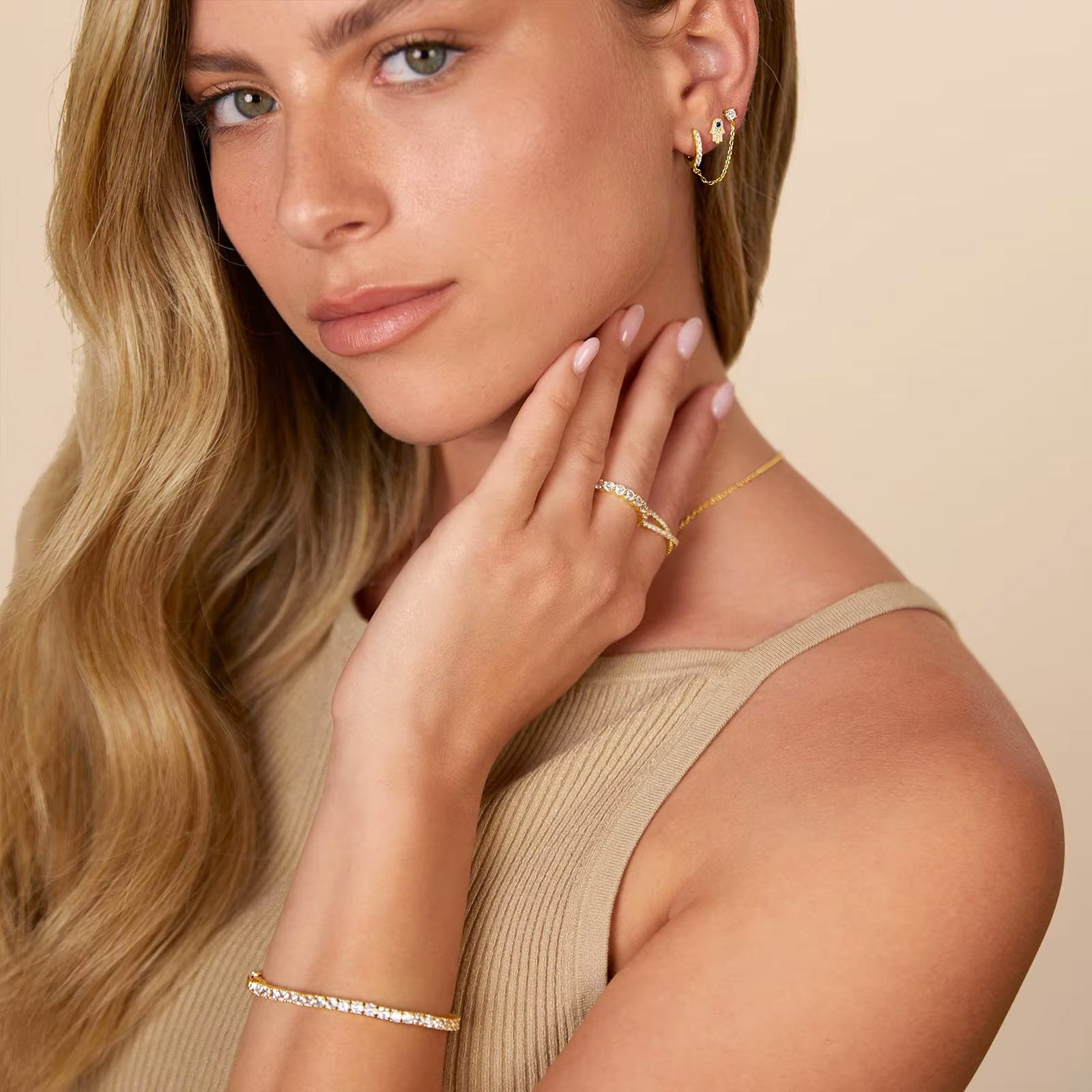 Kedjeörhänge som kombinerar ett stiftörhänge med en kristallprydd hoop, sammanlänkade med en tunn kedja för ett enhetligt uttryck. Tillverkat i 925 stämplad bas med gnistrande cubic zirconia. Avsett för dubbla hål och säljs som singelörhänge.