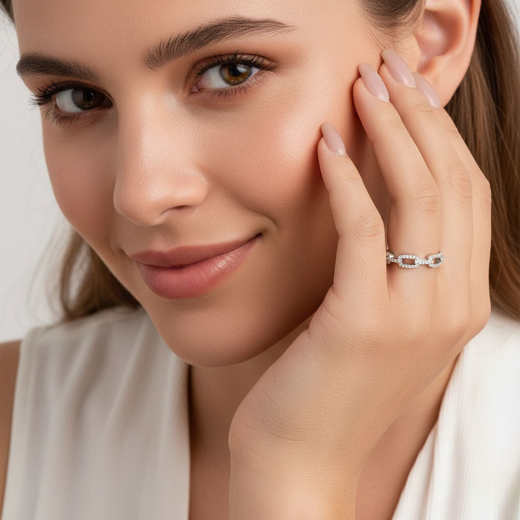 Denna ring kombinerar klassiska element med en modern och lyxig twist. Med gnistrande stenar som pryder varje länk, får du ett elegant och samtida utseende som fångar uppmärksamheten. Den är ett utmärkt val för den som söker en populär stil som smälter samman tradition och trendighet.