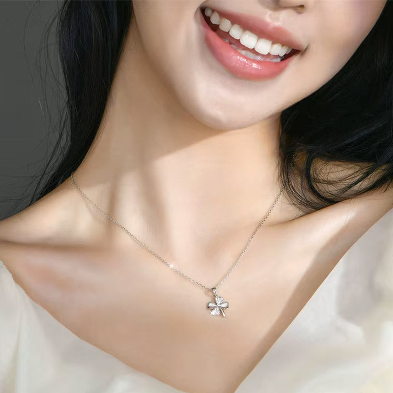 Ett stilrent halsband med ett fyrklöverformat hänge – en symbol för lycka. Hänget är delvis utsmyckat med gnistrande stenar som ger ett diskret men oslagbart lyster, medan de blanka bladen skapar en fin kontrast.