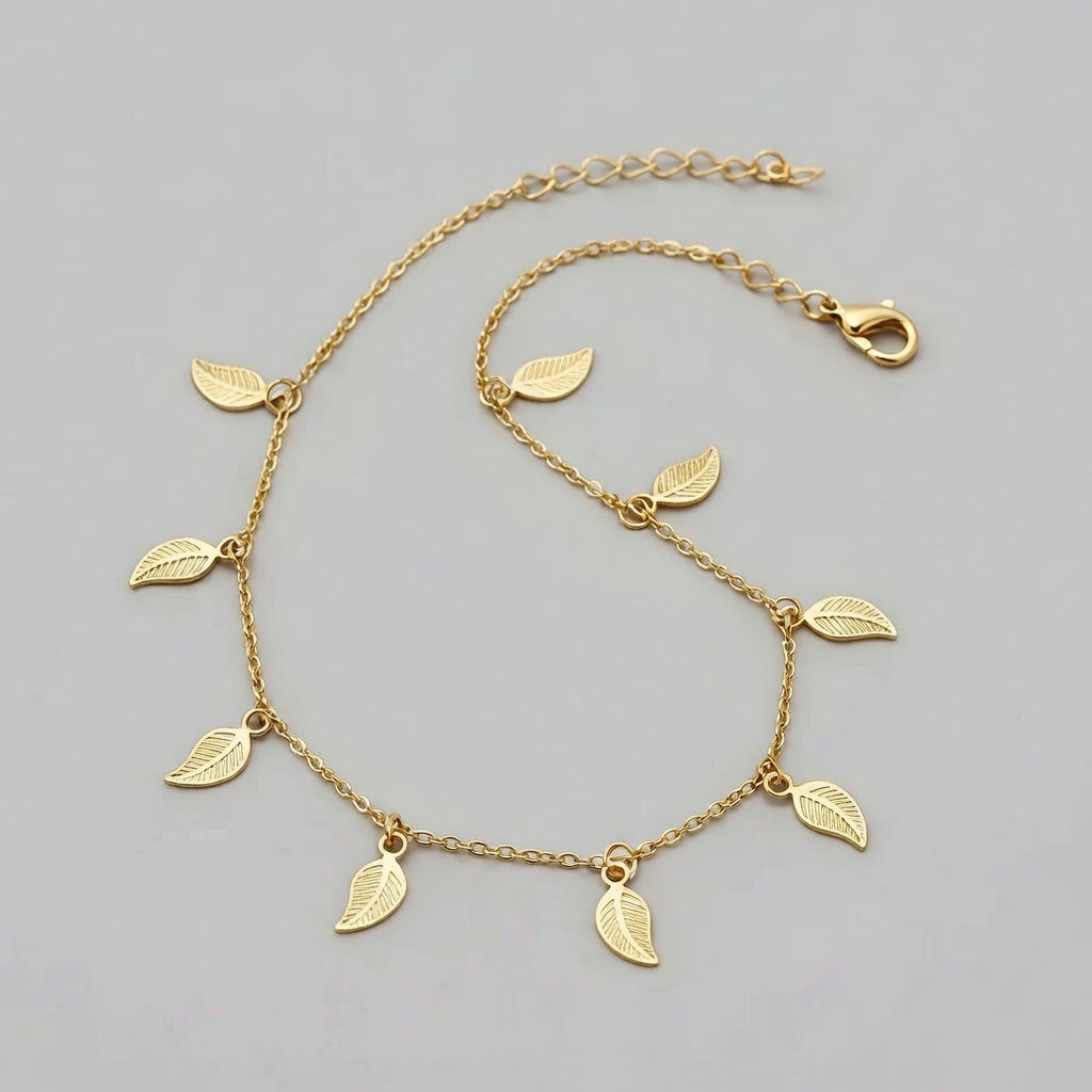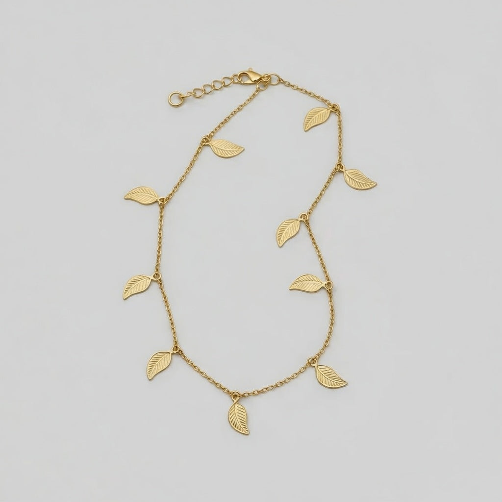 En unik och stilsäker fotlänk tillverkad av sterlingsilver, dekorerad med eleganta små löv som hänger vackert längs kedjan. Dess naturnära och distinkta design gör den till det perfekta valet för att addera en sofistikerad touch till både vardagsoutfits och festligare tillfällen.