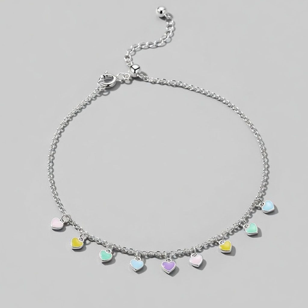 Denna charmiga fotlänk av sterlingsilver är dekorerad med små, färgglada hjärtan som skapar en lekfull och livfull känsla vid varje steg. Fotlänken är den perfekta accessoaren för att lägga till en touch av glädje och färg till din sommarlook.