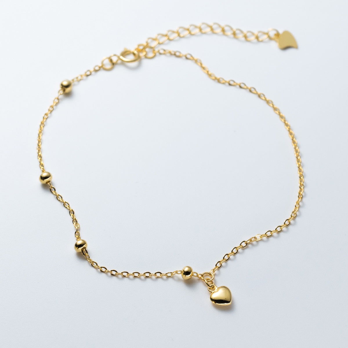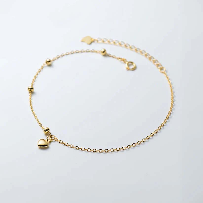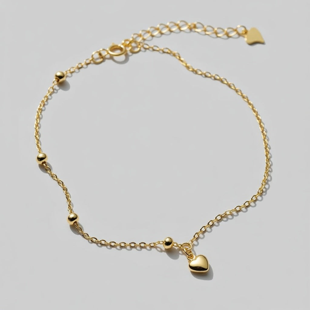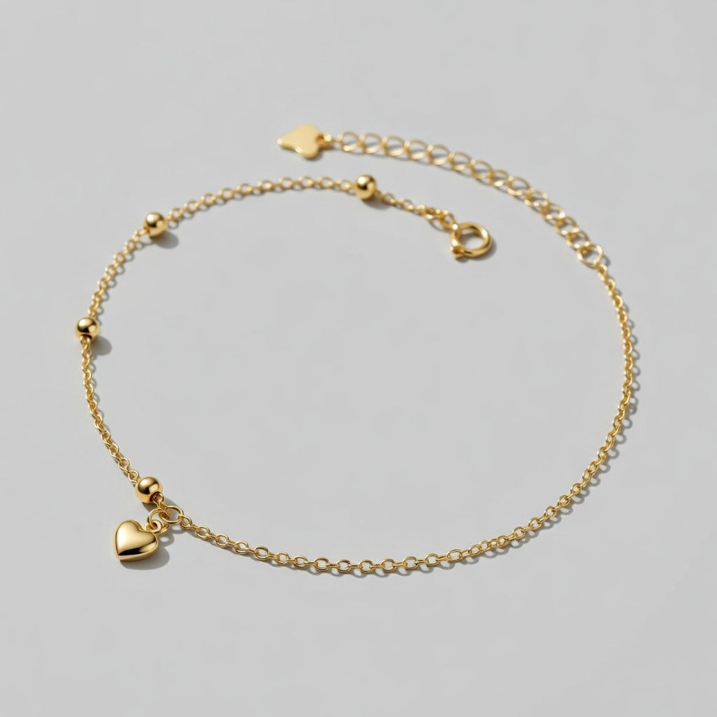 Fotlänk med små detaljer som ger ett charmigt uttryck. Hjärtberlocken och de små kulorna längs kedjan skapar en mjuk rörelse och ett elegant skimmer när du rör dig. Perfekt som en somrig accessoar som lyfter din look med en varm guldfinish.