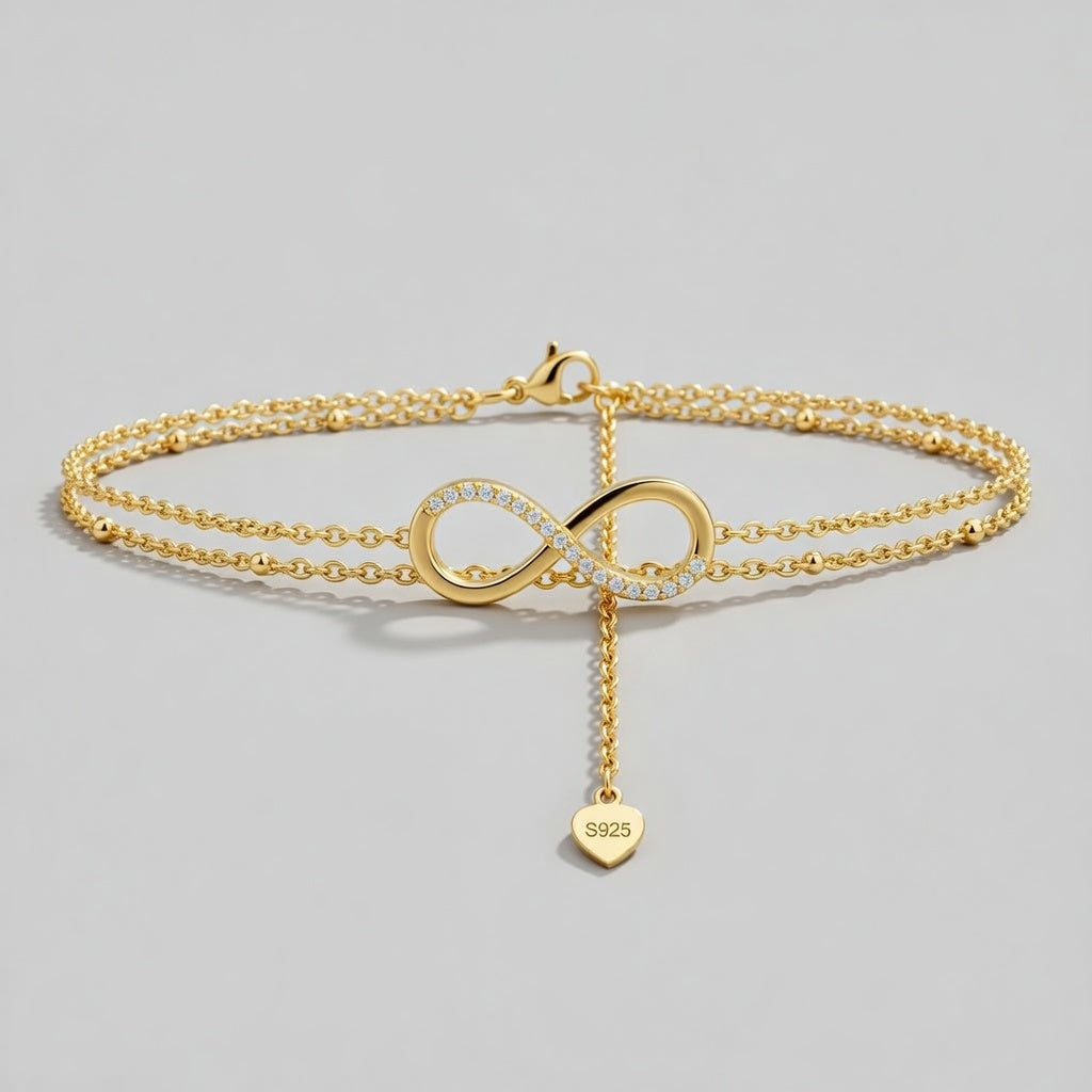 Denna stilfulla fotlänk med dubbla kedjor är tillverkad av sterlingsilver och dekorerad med skimrande zirkoner. Utsmyckad med en evighetssymbol och tillgänglig i både silver och guldplätering, blir den snabbt en självklar favorit.