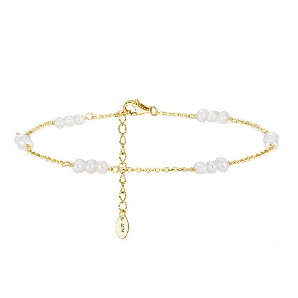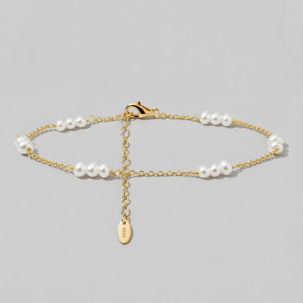 Delikat fotlänk med tunn kedja i sterlingsilver, prydd med små sötvattenspärlor i grupper för en balanserad design. Tillgänglig i silver eller guldplätering.