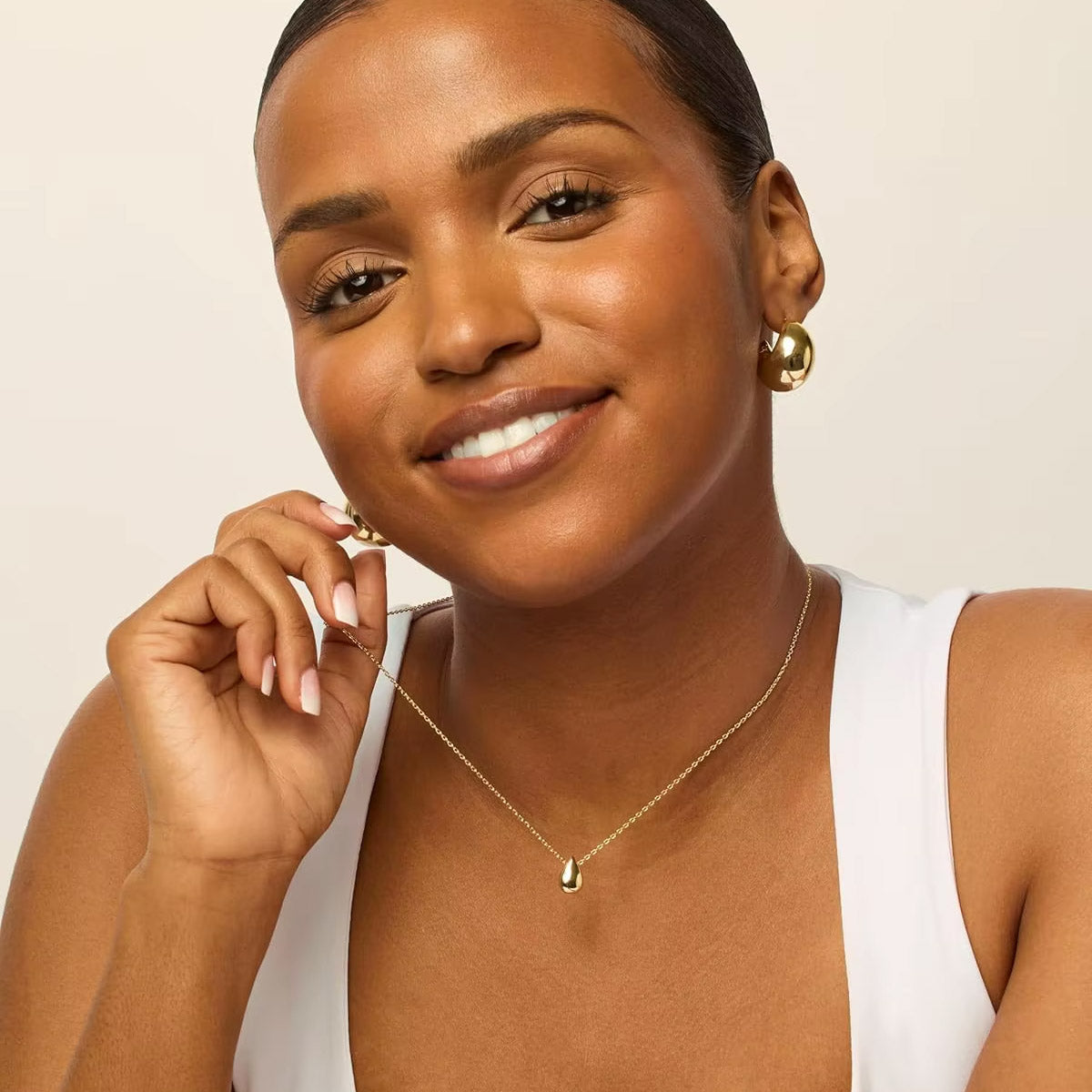 Halsband i rostfritt stål med ett mindre droppformat hänge i blank guldfinish. En enkel men distinkt detalj som passar till både vardag och finare tillfällen. Kedjan har en klassisk längd som ligger snyggt mot nyckelbenet.