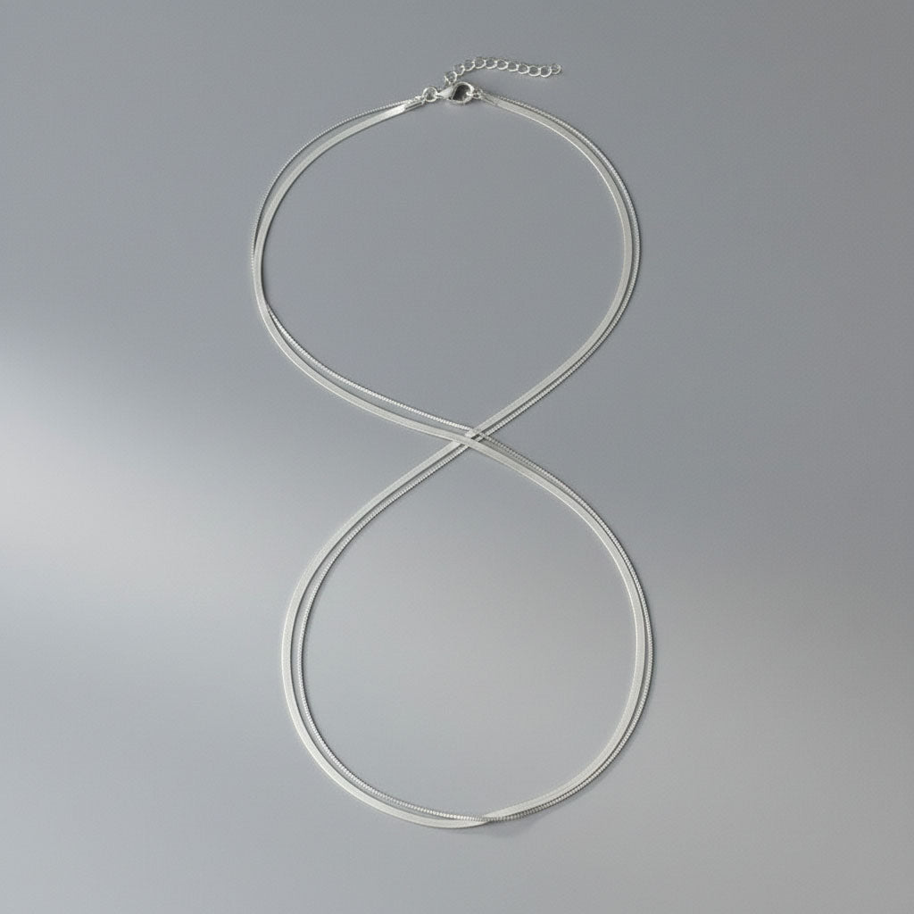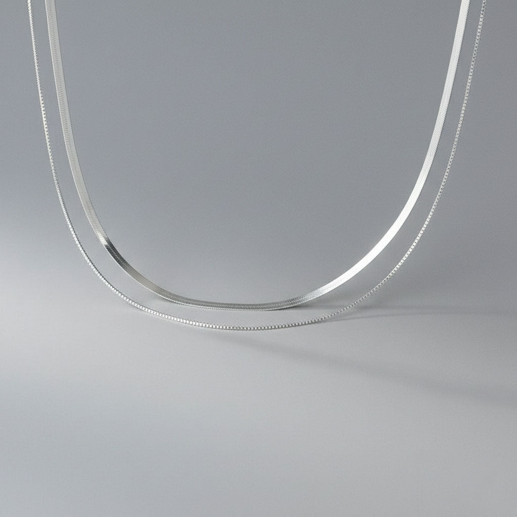 Ett halsband i sterlingsilver med dubbla kedjor där fiskbenskedjan möter en tunn silverkedja. Tillsammans skapar de ett klassiskt och stilrent uttryck med fin kontrast i form och struktur.