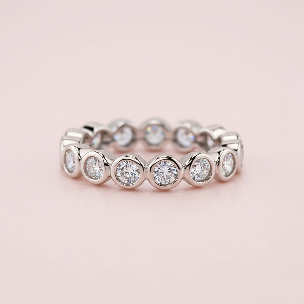 Ring i sterlingsilver med gnistrande stenar runt hela bandet, elegant infattade i rundade fästen för vacker lyster. En stilren och lyxig design som bärs lika fint ensam som tillsammans med andra ringar.