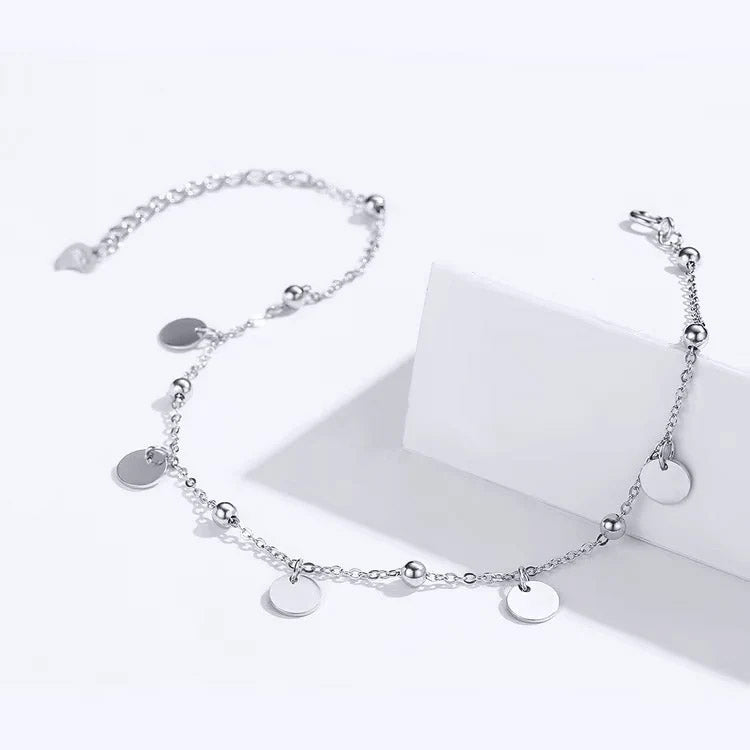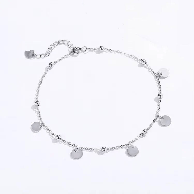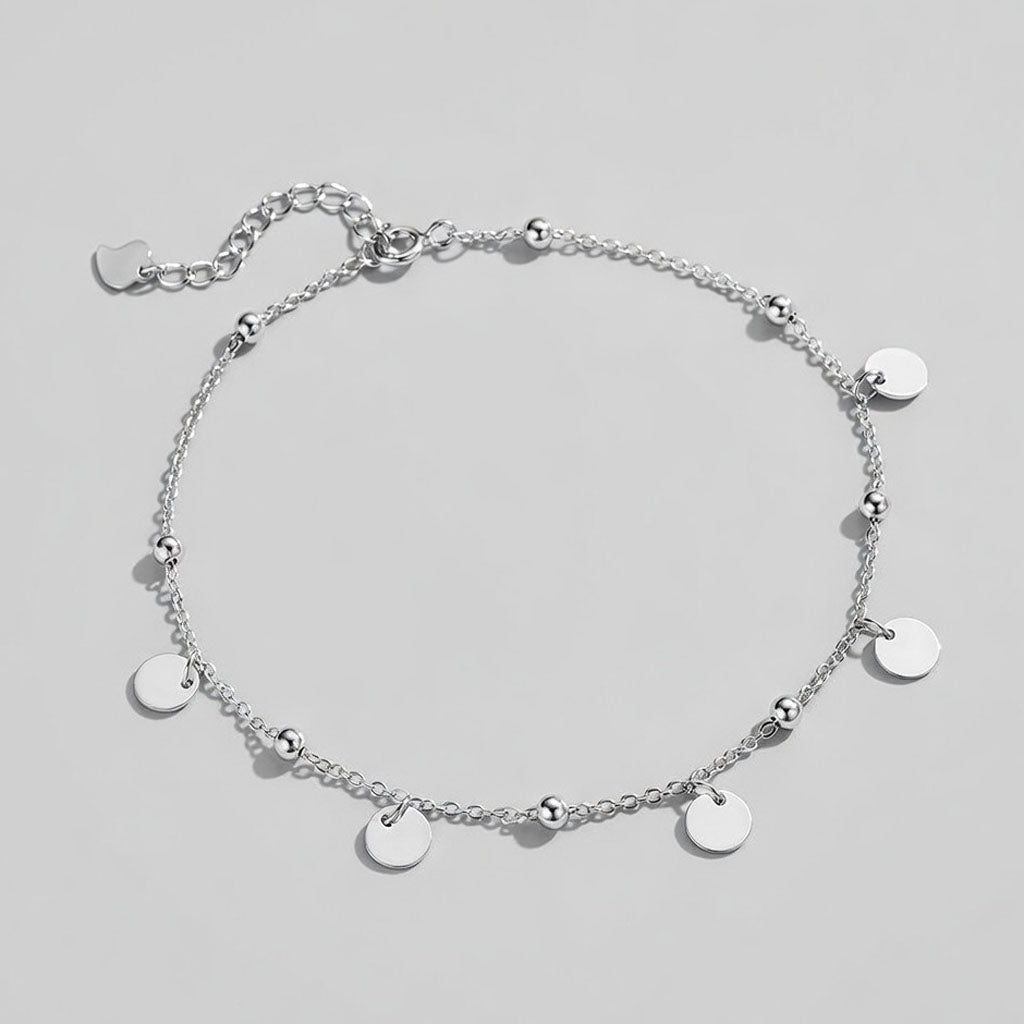 Minimalistisk fotlänk i sterlingsilver som pryds av runda plattor längs kedjan. Dess rena och enkla design gör den till ett utmärkt val för daglig användning. Perfekt för att addera en subtil detalj till din vardagsstil.