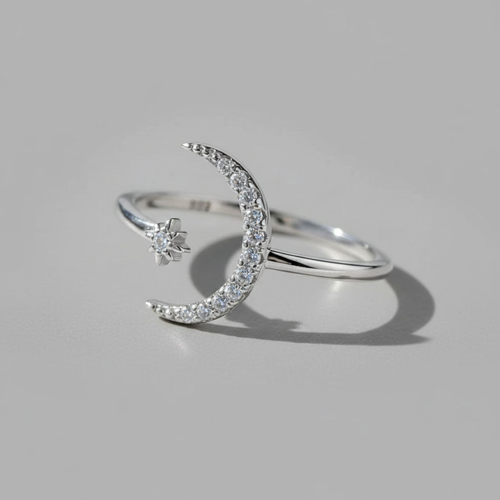 En stilfull och lättburen ring där måne och stjärna möts i en harmonisk design. De små gnistrande stenarna ger ett mjukt skimmer som lyfter helheten och gör ringen till en fin detalj i din vardag.