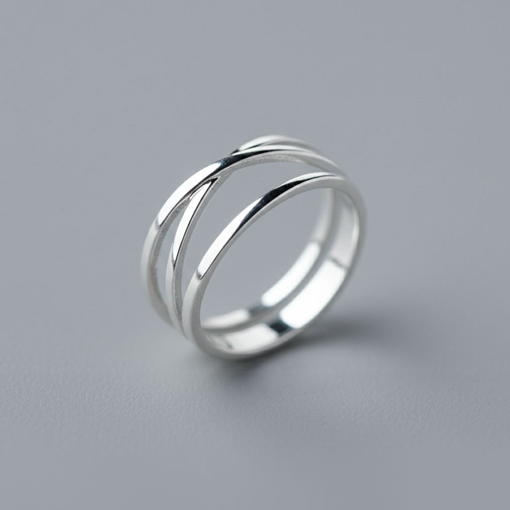 Upptäck skönheten i enkelhet med denna ring av sterlingsilver. Den har en stilren design med flera banor som går omlott, vilket ger en modern och elegant touch. Perfekt för att komplettera din look, vare sig det är till vardags eller fest.