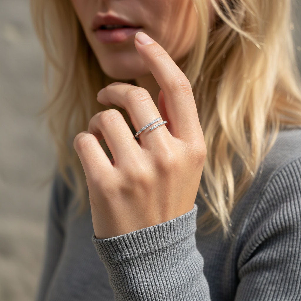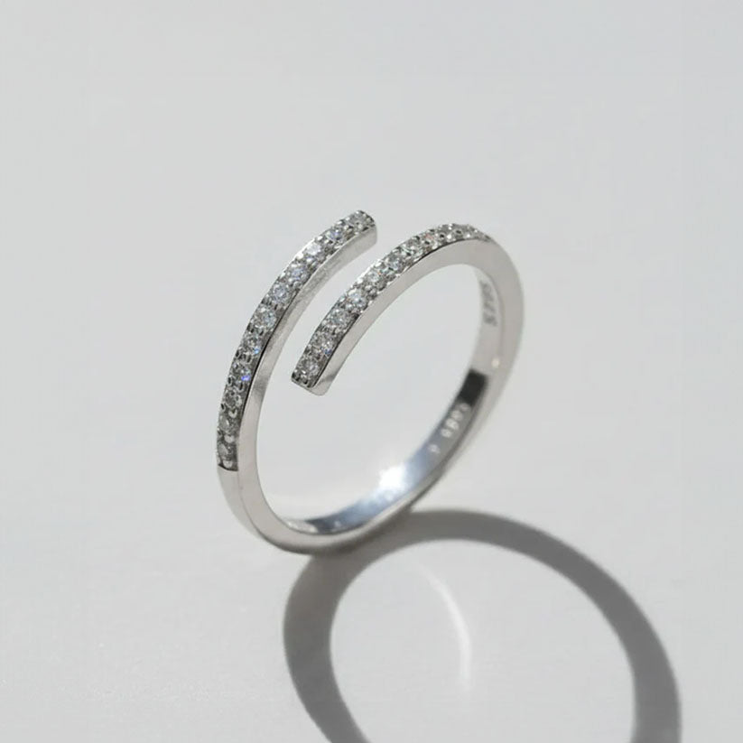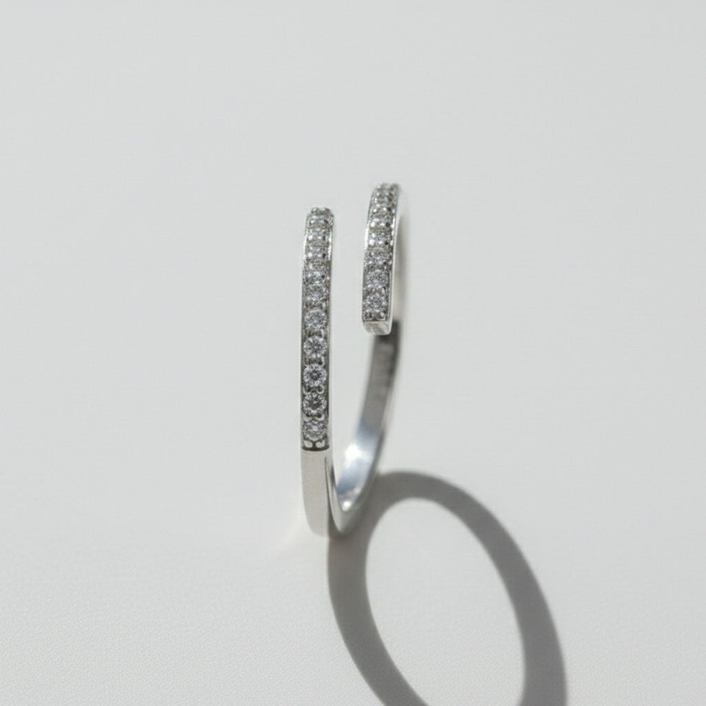 En elegant ring i sterlingsilver med mjukt överlappande design och gnistrande stenar längs kanterna. Den stilrena formen gör den lätt att bära varje dag och lika vacker vid speciella tillfällen. Ett smycke som kombinerar enkelhet och finess.