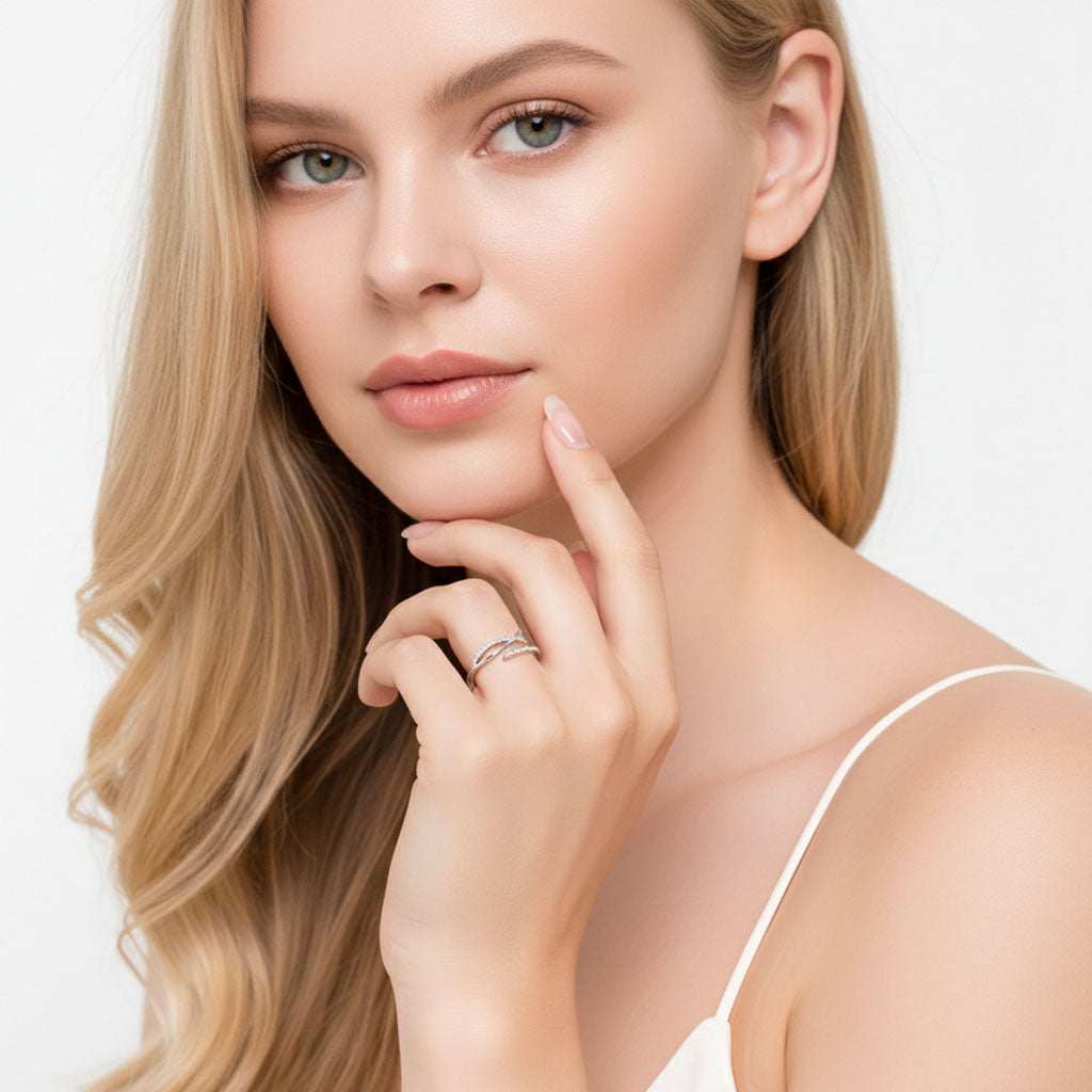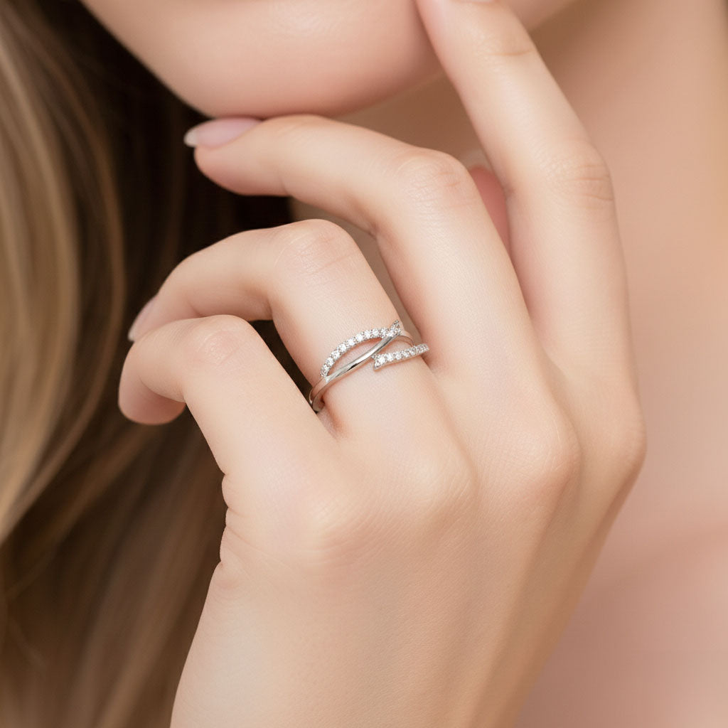 Ring i sterlingsilver med gnistrande zirkoner och en mjukt böljande form. Den justerbara öppningen gör att ringen sitter bekvämt och passar de flesta fingrar – en modern detalj som fångar blickar utan att kännas överdriven.