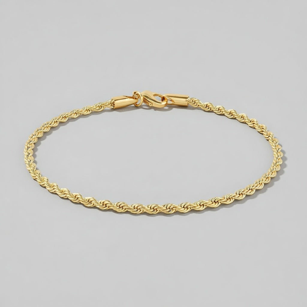 Stilfull fotlänk i rostfritt stål med tvinnad kedjedesign och blank guldfinish. Lätt och smidig att bära, med klassisk karbinhake för säker passform. En stilren detalj som passar både till vardag och sommarens lediga dagar.